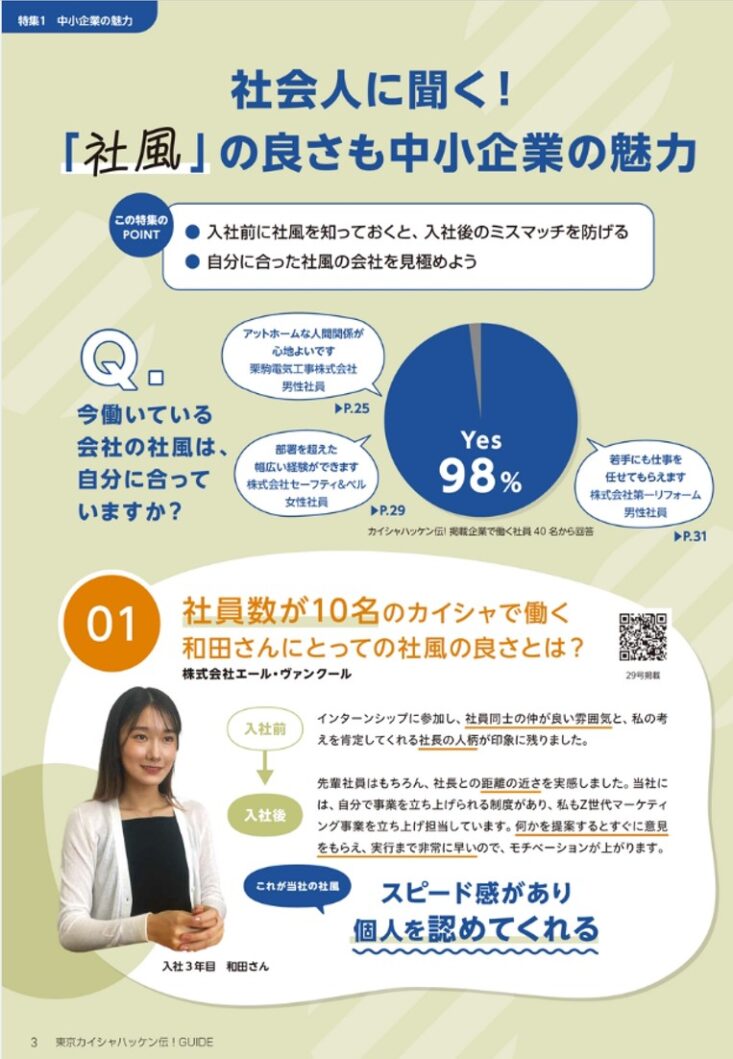 特集[社会人に聞く!「社風」の良さも中小企業の魅力]の中で、スピード感があり個人を認めてくれる社風の企業として紹介されています。